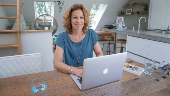 ‘Schrijven is het leukste wat er is. Dat doe ik aan deze tafel, alleen, en met een bak koffie. In mijn eigen bubbel vind ik het leukst. Ik word wel eens gevraagd of ik in dienstverband wil werken, maar dat wil ik niet. Ik ben gelukkig in mijn eentje als freelancer.’