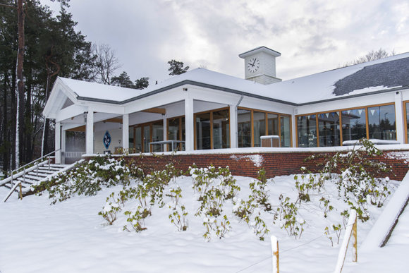 Ook het clubhuis is gebouwd in de stijl van een Engels landhuis. Het ligt verhoogd, waardoor je zowel buiten vanaf het terras als binnen vanachter de glazen ramen een wijd uitzicht over het hele complex hebt. De houten constructie past perfect bij de ligging in het bos.
