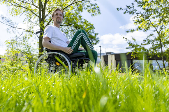 Menno zijn dwarslaesie is incompleet. Dat betekent dat zijn zenuw niet kapot, maar beschadigd is. ‘Volledig herstel is daardoor mogelijk’, klinkt het hoopvol. ‘De komende drie jaar kan mijn lijf uit zichzelf herstellen. Ik heb gelukkig al wat gevoel teruggekregen. In mijn voeten bijvoorbeeld. Maar alles is nog lang niet sterk genoeg om mijn lichaam te dragen. Ik kan nog niet zonder hulp op mijn linkerbeen staan. Rechts lukt nog helemaal niet. Alle spieren zijn slap, doen het niet meer. Ik heb geen idee hoeveel ik ga herstellen. Dat is ook niet te voorspellen, zeggen de artsen hier. Ik kan nog niet zo ver naar voren kijken. Nu gaat het er eerst om weer volledig thuis – ik woon samen met mijn vriendin – te leven. Daarvoor moet ik mezelf kunnen redden. Zelf naar de wc kunnen, met mijn rolstoel in de badkamer bewegen.’
