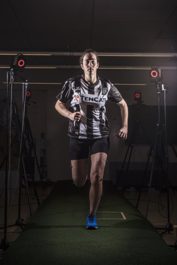 Vervolgens wordt er onderzoek gedaan met een ‘motion capture’-systeem, dat een sporter met een 3D-camera volgt in een beweging die hij maakt. ‘We werken nu met de ren-, stop-, en draai- en startbeweging van een hockeyer die we volgen. Met de 3D-registratie vangen we de complete beweging, en tegelijkertijd meten we de resultante krachten met een krachtenplatform, een soort weegschaal. En dan gaat het om de krachten in de voeten van de hockeyer, daar komen de krachten samen op het veld.’ De resultaten uit die twee typen onderzoek worden gecombineerd, zodat de krachten en krachtsmomenten op spieren en gewrichten berekend kunnen worden. Daaruit kunnen uiteindelijk conclusies worden getrokken over de verschillende kunstgrassystemen en de invloed van materialen en kunstgrasopbouw.