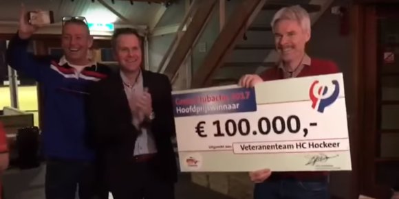 Wat doe je als je met je team honderdduizend euro (lees: €100.000 euro) wint. Over die vraag mogen de veteranen van Hockeer uit Cadier en Keer (Die club in Limburg met de hoogste gelegen velden van Nederland (fotoreportage)) zich buigen nadat ze de hoofdprijs wonnen bij de Grote Club Actie. Je weet wel, die actie waaraan je elk jaar meedoet voor je club maar waarvan je niemand kent die er ooit ook maar iets mee heeft gewonnen. Het bewijs is nu geleverd dat er toch geld wordt uitgekeerd, want er is een heuse video van de uitreiking gemaakt.
