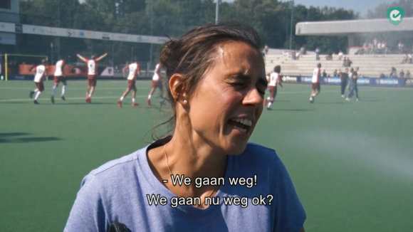 Oranje-Rood-coach Tina Bachmann had onze verslaggever nog zó gewaarschuwd. Vlak voordat het video-interview na de overwinning van Oranje-Rood op Pinoké begon, voorzag Bachmann dat de sproeiers weleens een probleem konden gaan vormen. Ze dacht dat ze tijdens het interview nat gesproeid zouden worden als het interview op deze plek op het veld zou plaatsvinden.
