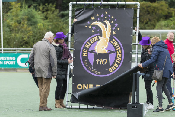Wat in ieder geval duidelijk is: KZ bestaat 110 jaar. En de foto die u ziet is genomen met windkracht tien, nadat het de hele wedstrijd KZ-Den Bosch (1-3) geregend had. Terwijl de meest ijverige Haagse leden druk bezig waren met hun paarse hoed en de onthulling van het jubileumthema, waren de verregende toeschouwers al lang een drankje aan het doen in de houten blokhut. Daarom heeft bijna niemand dit tafereel gezien, behalve onze fotograaf.