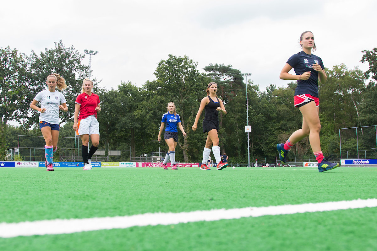 Maddie Hinch (uiterst rechts) aan het rekken. Links van Hinch Sarah Jaspers, daarnaast Julie Brinkman. Foto: Willem Vernes