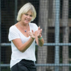 De jeugd slimmigheidjes aanleren is aan haar besteed. Ze loopt met de bal richting de goal en doet voor op welk moment je een pass moet geven, zodat je de verdediger misleidt. ‘Het is dreigen, dreigen, dreigen.’ Geeft backhandpasje naar rechts: ‘En dan, op het goede moment: tsjak!’