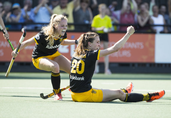 Caia van Maasakker en Marlies Verbruggen duelleren om de bal. Foto: Willem Vernes.
