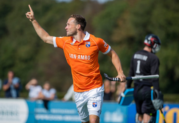 Maico Casella Schuth juicht na zijn treffer tegen Kampong. Foto: Frank van der Leer/Orange Pictures
