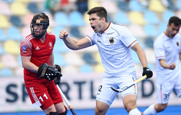 Gonzalo Peillat juicht na zijn eerste treffer voor Duitsland tegen Spanje in de Pro League in Mönchengladbach. Foto: FIH
