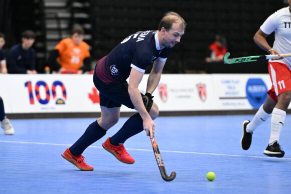 Jeroen Dijkema in actie voor de Verenigde Staten tijdens de Pan Am Cup in de zaal. Foto: USA Field Hockey/PAHF