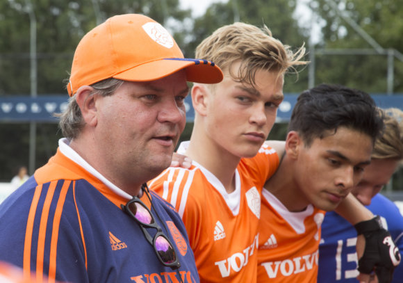 Bondscoach Eric van der Pol kijkt met opgeheven hoofd vooruit na de 1-0 nederlaag tegen Spanje. : “De Spanjaarden scoorden al na twee minuten een ‘onverwachte verwachte goal’. Ze flatsten de bal van grote afstand de cirkel in en iemand tikte de bal net eventjes aan en die vloog erin. Dat is die creativiteit waar ik eerder over sprak, het is geen toeval dat ze zo scoren. Maar het is goed voor de jongens om dit te ervaren. Pas drie jongens hebben eerder tegen Spanje gespeeld.”