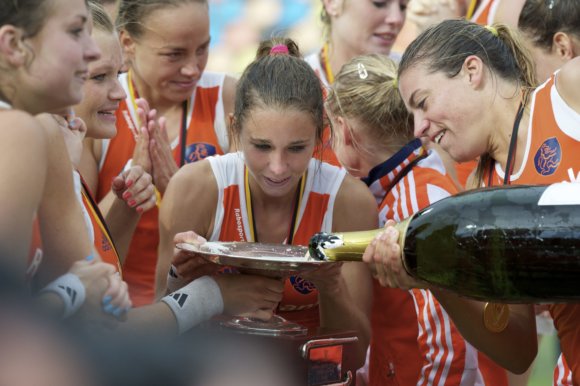 Kim Lammers, Ellen Hoog en Maartje Paumen na het behalen van de wereldtitel in Den Haag, 2014