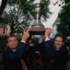 Hattrick-held Chris Ciriello kust de wereldbeker. Hij gelooft dat je de beker nooit mag aanraken voor de wedstrijd. Foto: Willem Vernes