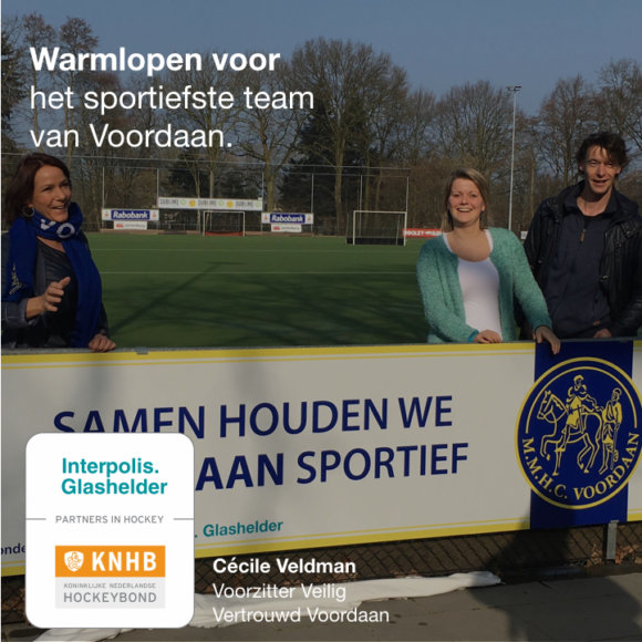 ‘Een mooi wapenfeit van de commissie Veilig Vertrouwd Voordaan is op 12 maart gepresenteerd: een bord langs het veld met de slogan ‘Samen houden we Voordaan Sportief’ en een bord in het clubhuis met acties waar we trots op zijn, zoals elkaar steunen, met respect de tegenstander en scheids benaderen en genieten van al het moois op het hockeyveld! Dit is mede tot stand gekomen dankzij Interpolis, die als partner van de KNHB veiligheid op en rond het hockeyveld in een hoog vaandel heeft staan. Zij hebben ons goed geholpen bij de acties op de club.’