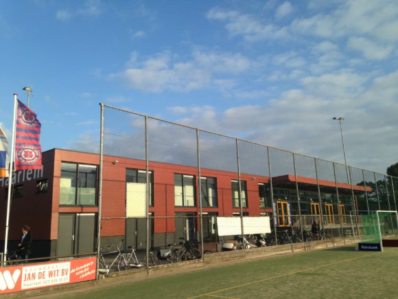 Rood/kobaltblauw horizontaal gestreept shirt, kobaltblauwe broek/rok, rood/kobaltblauw horizontaal gestreepte kousen