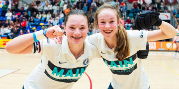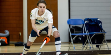 Donkerrood shirt/blouse met twee horizontale smalle blauwe banden, donkerblauwe broek/rok, donkerrode kousen met twee smalle blauwe banden