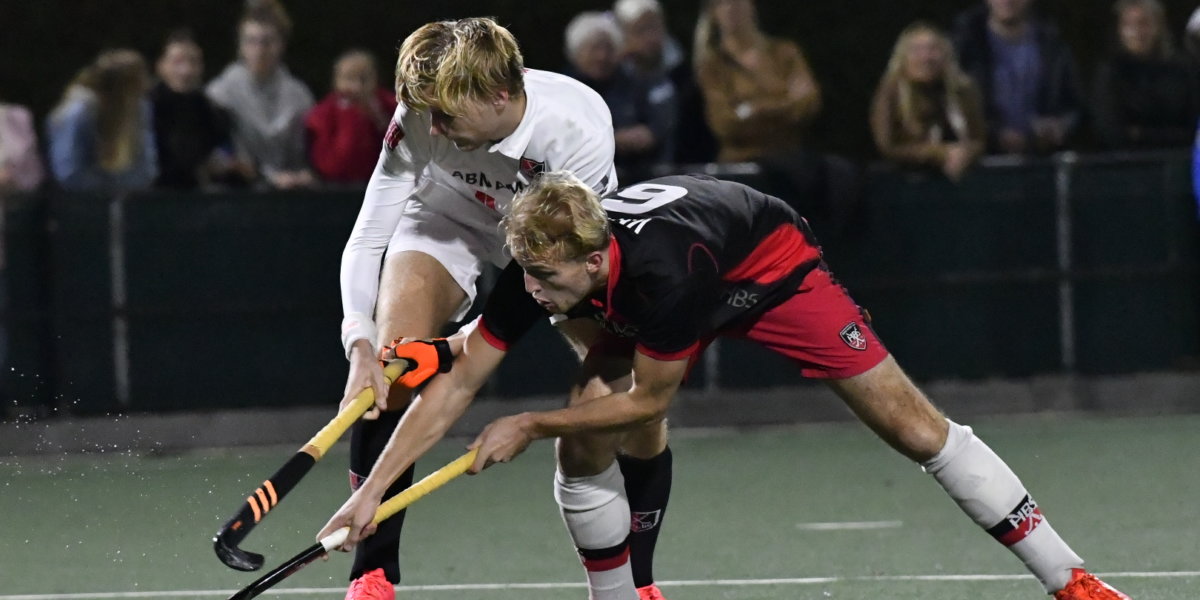 Sam Willemsen (SCHC JA1) en de 16-jarige Tijs van Horn maakten tijdens het duel met Hilversum in de Gold Cup hun eerste minuten in het eerste team van SCHC. Foto: SCHC