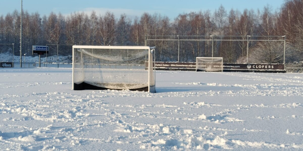 Meer sneeuw dan hockey bij ’t Spandersbosch: het veld en de goals bevroren en onder een dikke laag wit.