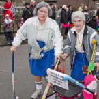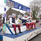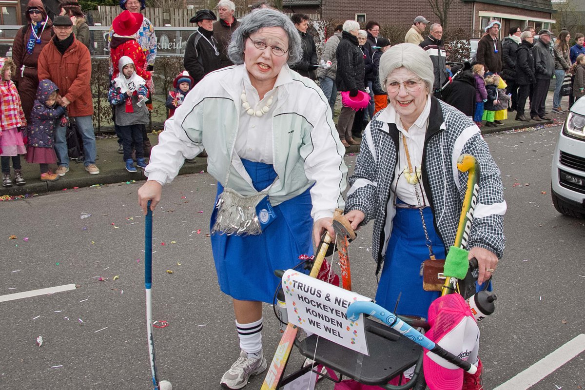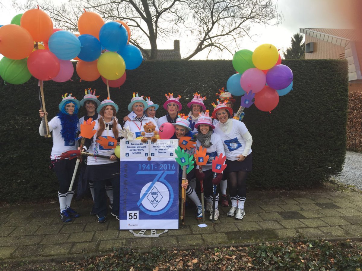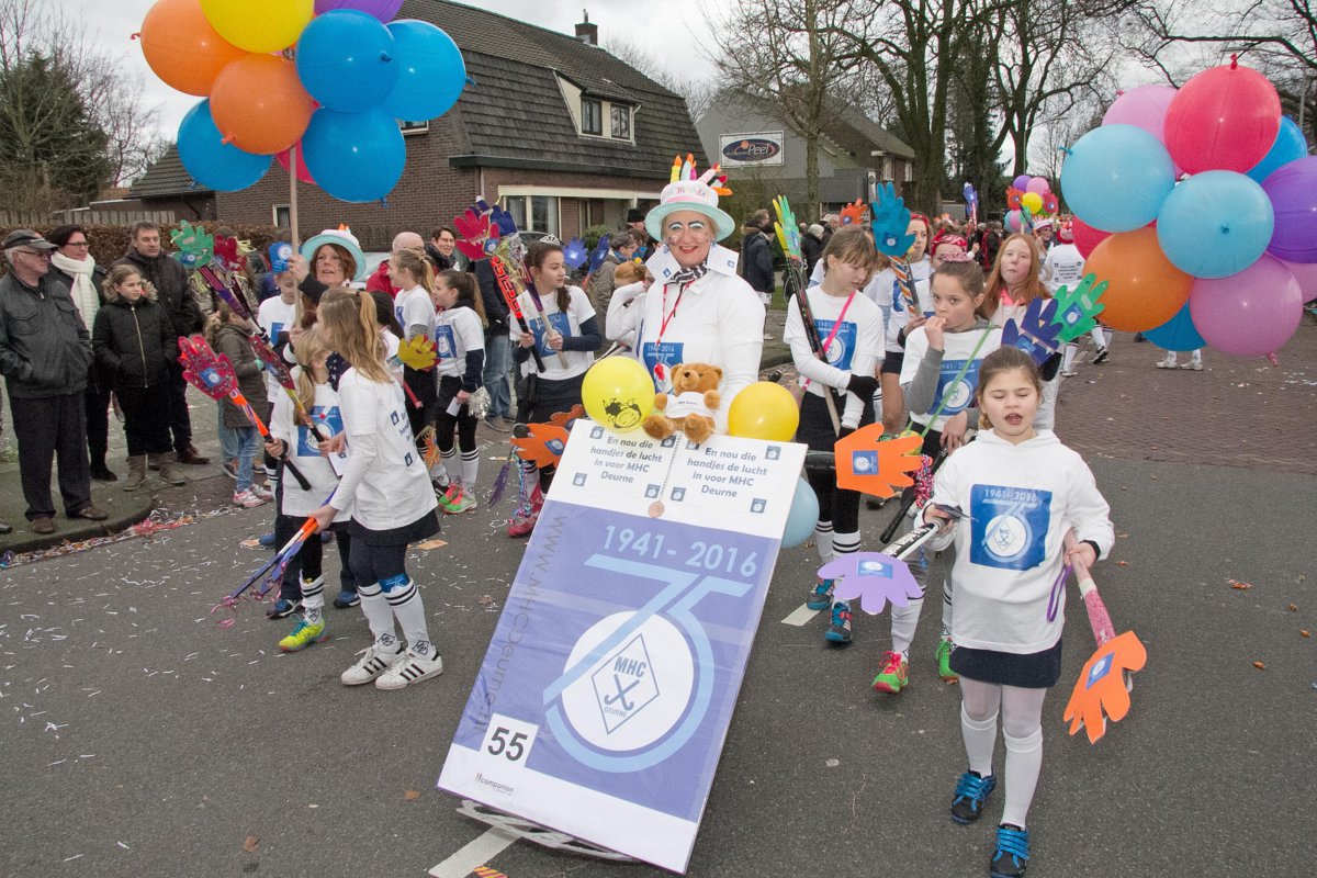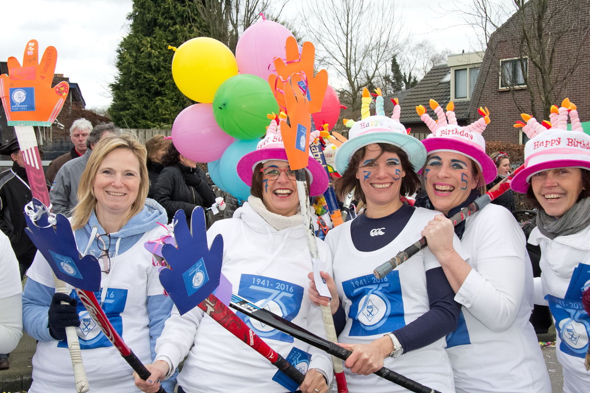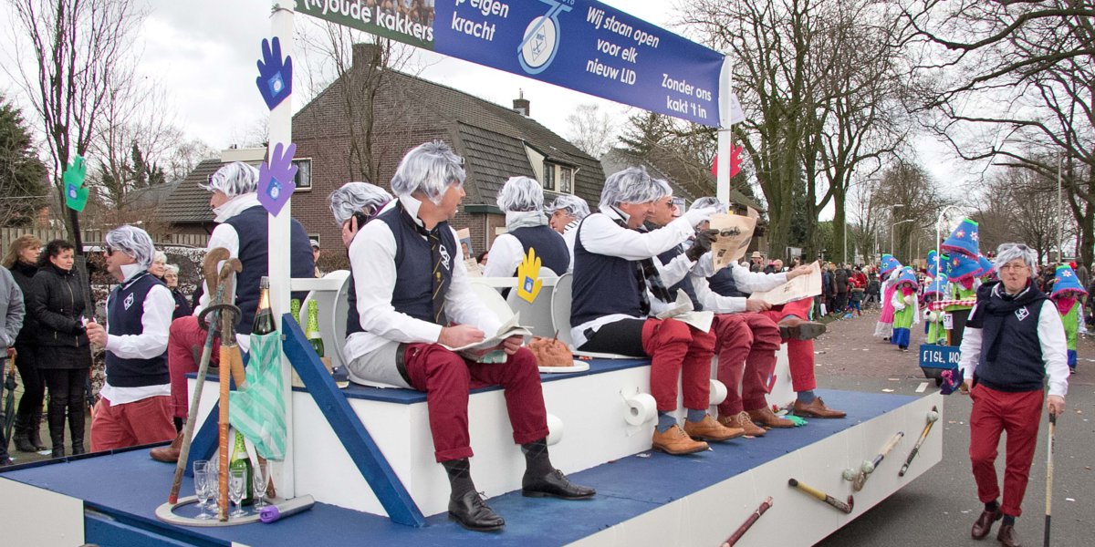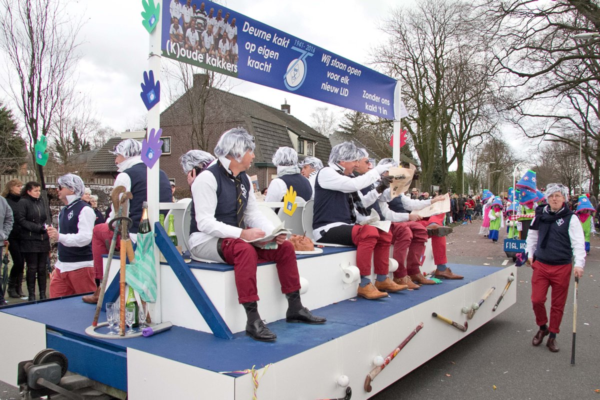 Met het thema ‘(K)oude Kakkers’ verwezen de veteranen met hun praalwagen naar het 75-jarig bestaan van hun vereniging. Wentholt: ‘We wilden ons jubileum onder de aandacht brengen en daarom zijn we 3 weken geleden begonnen met het ronselen van mensen om mee te lopen in de optocht.’ En met succes, want MHC Deurne liep zondag met maar liefst 50 vrolijk uitgedoste leden door de straten van Deurne. De heren namen plaats op – de toiletpotten op – de praalwagen en de dames liepen met de jeugdleden voorop.