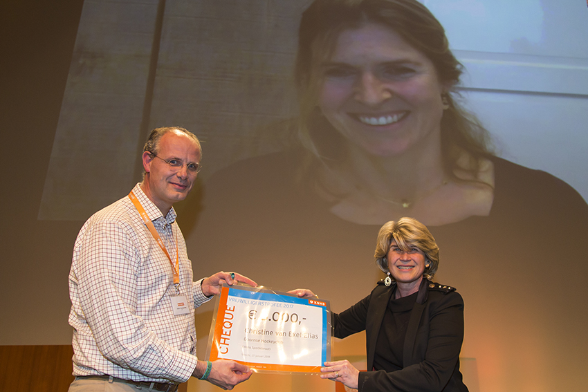 Omdat haar zoon voor de Nederlands kampioenschappen Zaal in Arnhem moest spelen, ontving voorzitter van Doorn Harry Kampschöer op het podium de cheque van vijfduizend euro voor een veiliger sportklimaat op de Doornse Hockey Club. Van Exel-Elias sprak via een Skype-verbinding. ‘Ik ben hier superblij mee. Wij wilden echt aan de slag met een aantal zaken op de club’, richtte ze zich rechtstreeks tot de zaal. ‘We hadden kinderen die gepest werden. Ouders die meteen wegreden na de wedstrijd, zonder nog wat ranja te drinken. Ouders met een stopwatch langs de lijn, die het wisselen van hun kinderen in de gaten hielden. Het fluitgedrag werd bekritiseerd. Daarom zijn we op de club vol aan de slag gegaan om dit te verbeteren en allemaal het goede voorbeeld te geven.’