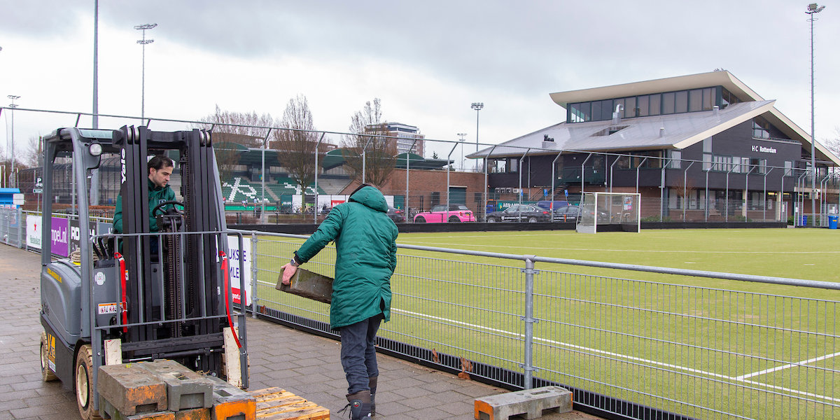 De Oranje Heren spelen dinsdag op HC Rotterdam de eerste Pro League-wedstrijd op Nederlandse bodem. Voordat de wedstrijd om 18.45 uur überhaupt kan beginnen moet er aan de Hazelaarweg de komende dagen van alles gebeuren om het terrein ‘Pro League-proof’ te krijgen. In de stromende regen trapten zondagmiddag al zo’n vijfentwintig vrijwilligers van de club de werkzaamheden af.