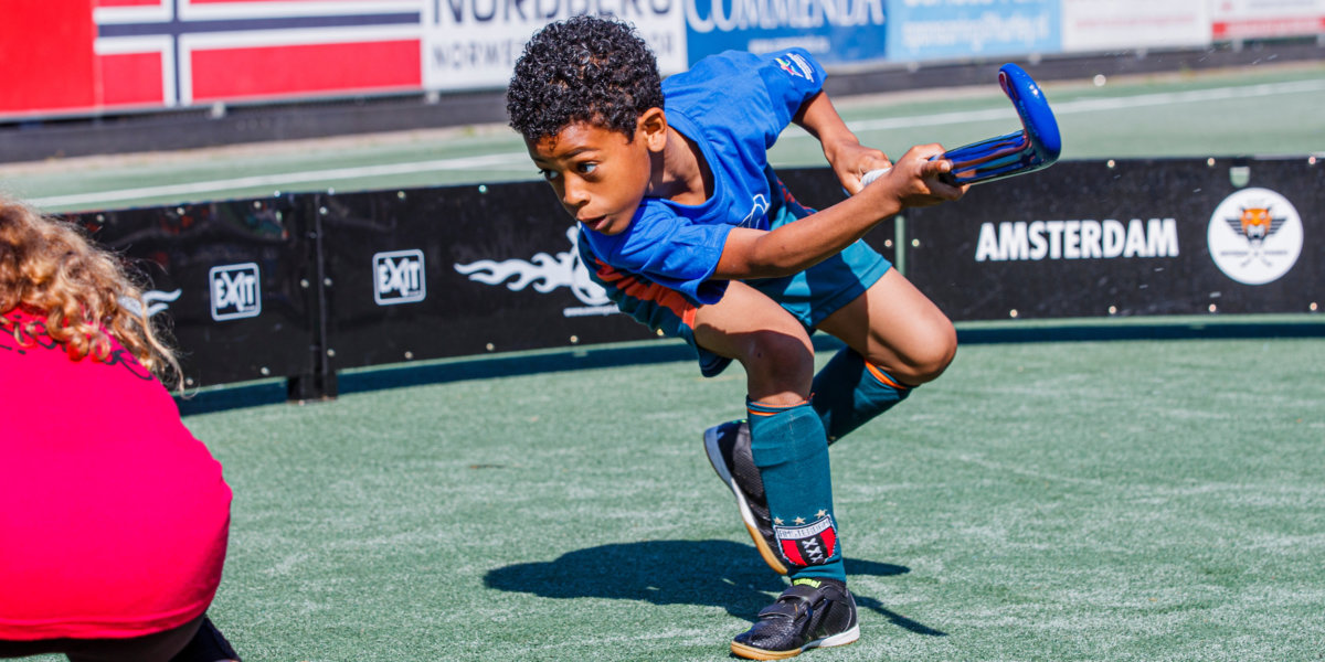 De hockeybond gaf de afgelopen maanden samen met de Hockey Foundation en de gemeente Amsterdam op dertien verschillende pleinen hockeyclinics. Een gratis naschoolse activiteit in de wijk om steeds meer kinderen kennis te laten maken met hockey. ‘Al deze kinderen die hier nu zijn hebben op de pleintjes in de buurt verschillende hockeytricks geoefend’, legt Peter Hoitinga, voorzitter van Amsterdam Dynamics, uit.