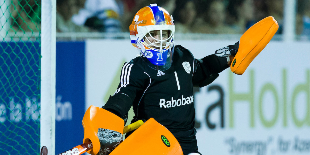 Pakistaanse keeper Salman Akbar staat op voorvoeten. Foto: Willem Vernes