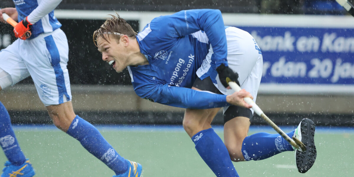 De verdediging van Kampong bij een strafcorner tijdens een wedstrijd in de Tulp Hoofdklasse. Foto: Koen Suyk