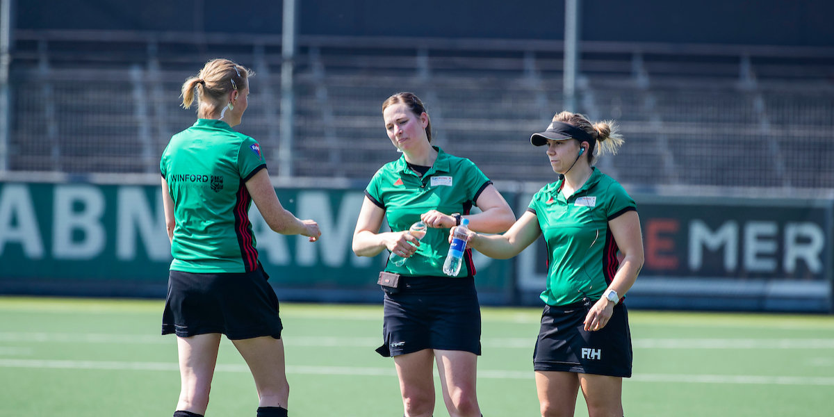 Even terug naar het fragment. Die wedstrijd tussen Kampong en Hurley. Jip Janssen sleept zijn corner vanaf kop cirkel. Zijn inzet belandt op het lichaam van Casper van Loon, een van de cornerverdedigers van Hurley. What to do? Bondsscheidsrechter Ymkje van Slooten (op de foto in het midden) geeft antwoord op deze lastige situatie.