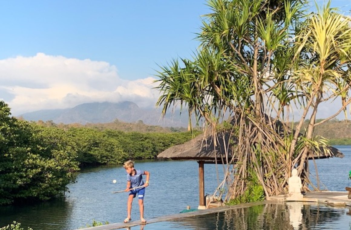Hugo van der Schoor besloot om – net als iedere vakantie bij de Van der Schoors – ook naar Bali, gewoon zijn stick mee te nemen. Het zal voor wat ongemakken hebben gezorgd op het vliegveld, maar deze foto is het zeker waard. Hugo heeft aan zijn hooghoudskills gewerkt in de jungle, met op de achtergrond de vulkanen van Oost-Java. Laat ze bij terugkomst in Bloemendaal maar zien wat je kan, Hugo!