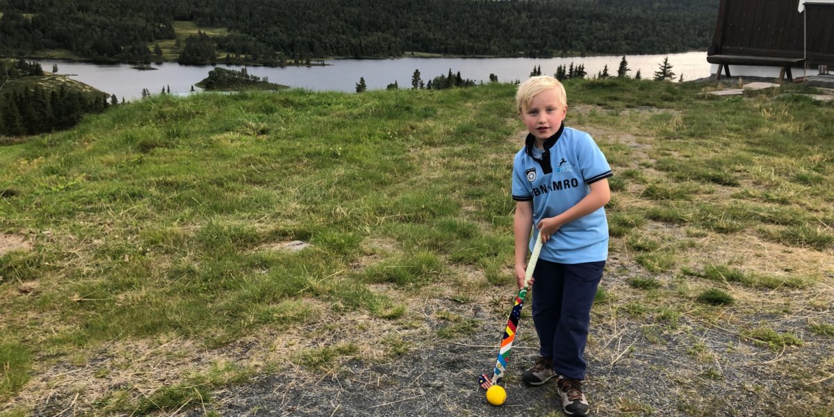 En daar is de eerste man, eh jongen, in dit gezelschap. Om precies te zijn Sidney van Eerde. De topper van HGC F3 nam niet alleen zijn stick mee naar Noorwegen, maar ook zijn shirt. Alles voor het perfecte plaatje. Dit plaatje is geschoten in Nesbyen, waar familie van Sidney woont. Hoe internationaal kan je het hebben, met familie in het buitenland, zelf vernoemd naar een wereldstad en zelfs een stick vol vlaggen.