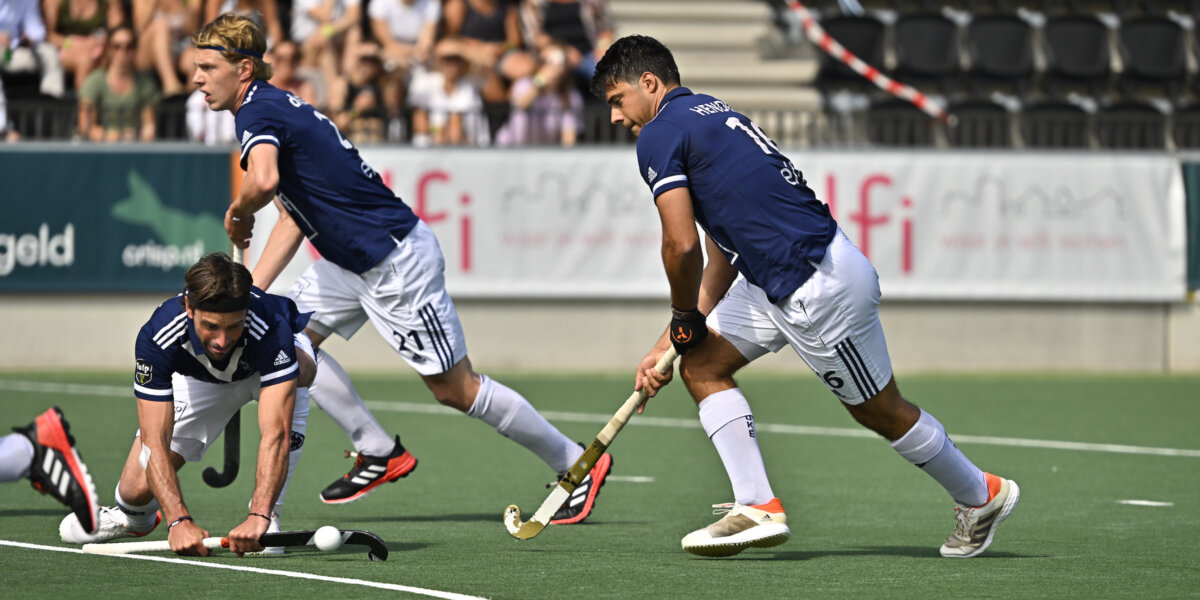 De verdediging van Oranje-Rood bij een strafcorner tijdens een wedstrijd in de Hoofdklasse. Foto: Koen Suyk