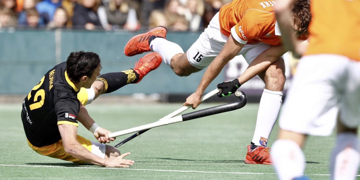 Pepijn Reijenga (Den Bosch) met Arthur van Doren (Bldaal) tijdens de hoofdklasse competitiewedstrijd hockey heren, Bloemendaal-Den Bosch (2-1) Foto: Koen Suyk