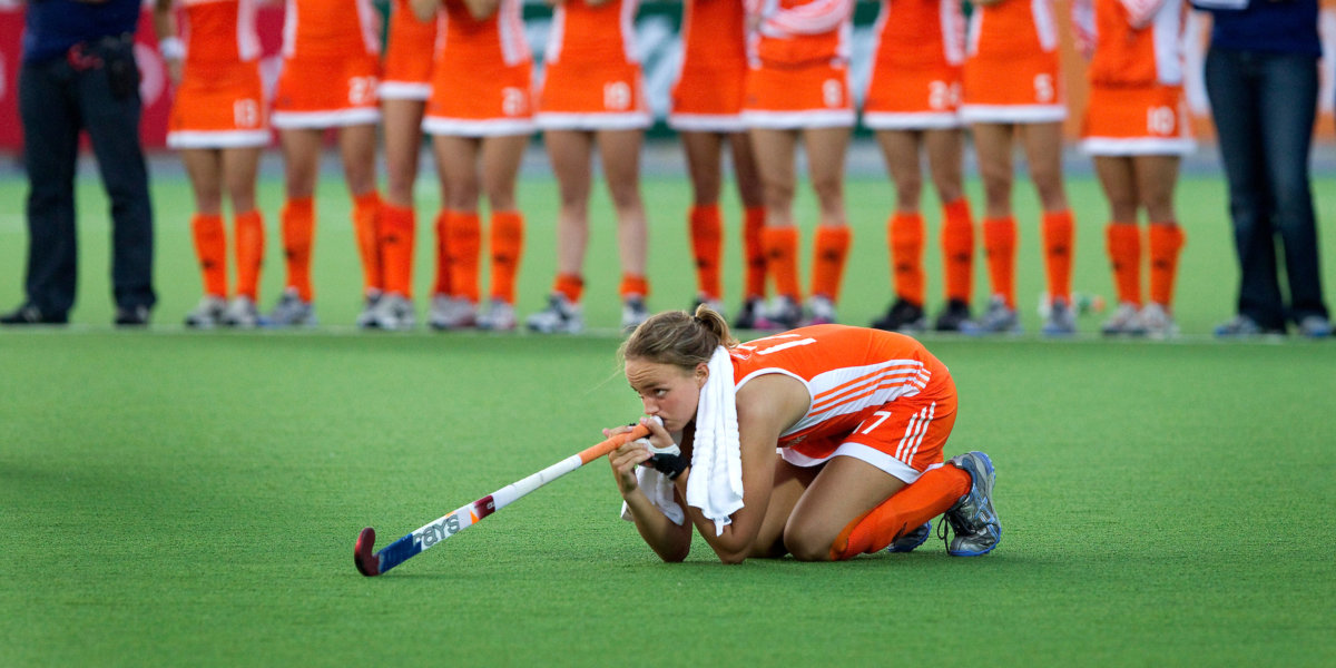 Met de mond op de steel van haar stick en het hoofd wat gebogen, durft Maartje Paumen (235 interlands, 195 doelpunten) nauwelijks te kijken wat er gebeurt, tijdens de strafballenserie tussen Nederland en Engeland, in de halve finale van het WK in Rosario, Argentinië. De ogen van de strafcornerschutter van Oranje kijken gespannen omhoog.