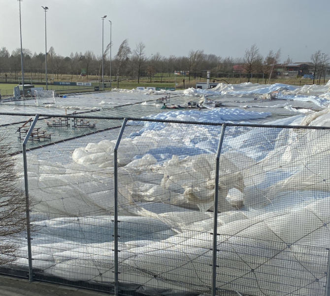 Storm Eunice heeft een ware ravage aangericht onder de blaashallen bij hockeyverenigingen. Sinds vrijdagmiddag zijn de blaashallen voor zaalhockey van Ring Pass, Rotterdam, Laren, Westerduiven en Leonidas verwoest. De schade loopt in de miljoenen euro’s, honderden hockeyduels kunnen dit weekend niet doorgaan.
