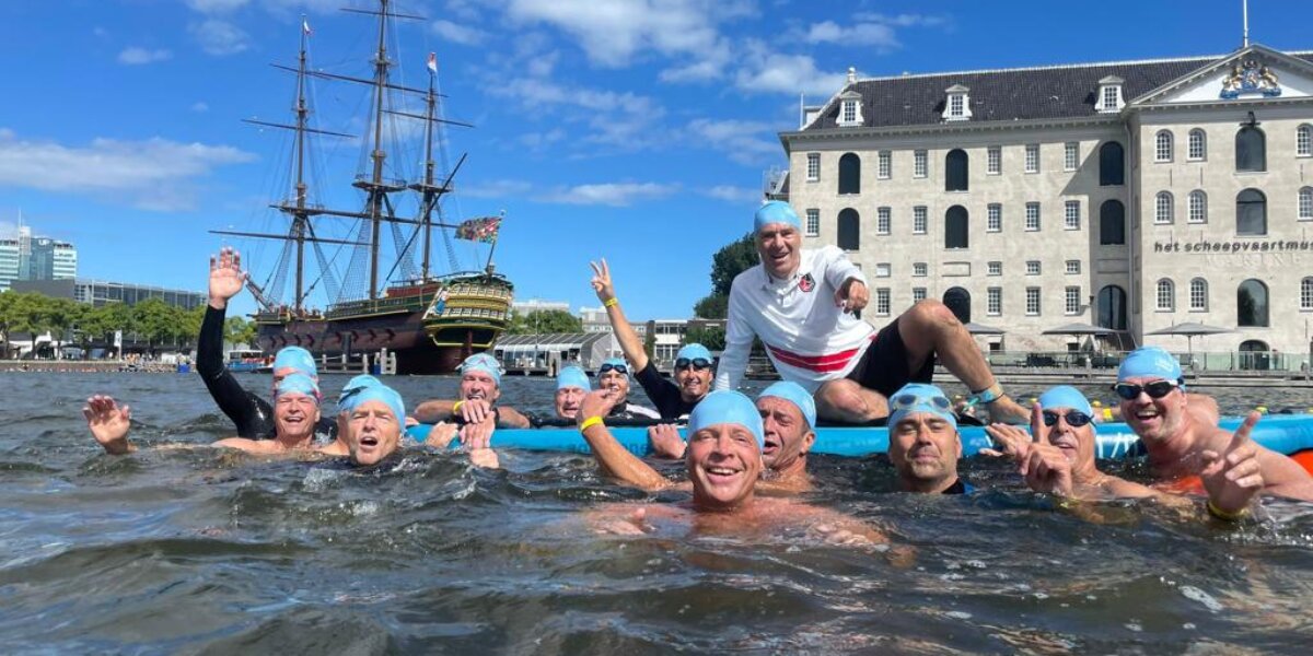 Hockeyen doen ze al ruim twintig jaar samen. Toch kreeg de band van de heren van Amsterdam Veteranen 45+A afgelopen zondag een nieuwe dimensie. Het team deed mee aan de Amsterdam City Swim om geld in te zamelen voor onderzoek naar ALS: de spierziekte waar hun teamgenoot Bas Veenemans aan lijdt.