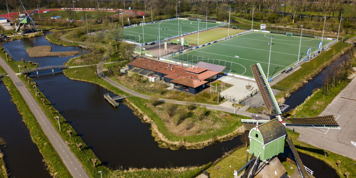 ‘Door het coronavirus gingen de hockeyclubs op slot. Voor hockey.nl bezocht ik die gesloten verenigingen en maakte ik daar een fotoreportage van. Deze foto is gemaakt bij Rapid uit Gorinchem. Ik heb deze opname gemaakt met een drone. Het is een mooi beeld van een verlaten sportpark, gelegen tussen de windmolens.’