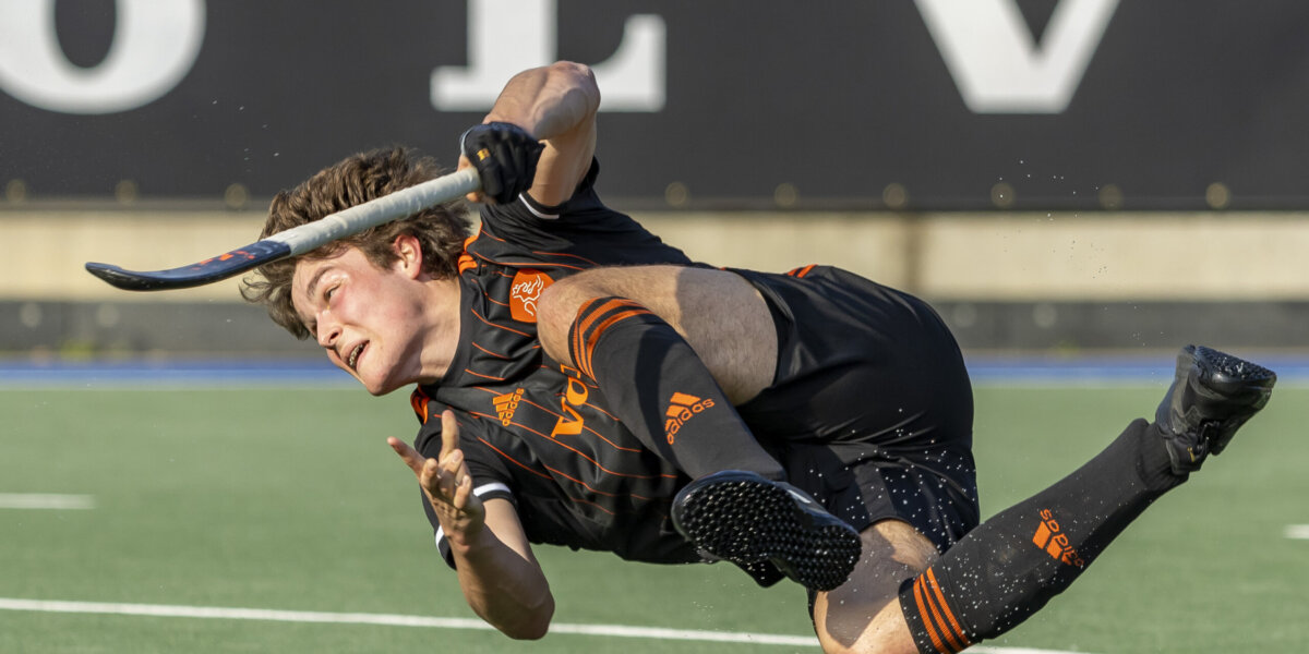 2. Flying Joost Tolboom bij zijn wedstrijd van Jongens O18 tegen Engeland. Hij probeert zo veel kracht in zijn strafcorner te leggen dat hij uitglijdt en vervolgens horizontaal in de lucht hangt.