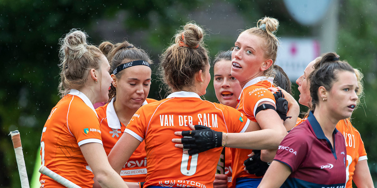Eén voor één vlogen ze hun ouders, vrienden en andere fans in de armen na afloop van de zege in het kletsnatte Den Haag. Naast de regendruppels droop ook de opluchting van de gezichten af bij Bloemendaal. ‘We hebben het te spannend gemaakt’, zegt de compleet verregende aanvoerder Sanne Caarls. ‘Nadat KZ op 2-2 kwam, dreigde de wedstrijd uit onze handen te glippen. Puur op mentaal en door heel hard te werken hebben we ‘m gewonnen.’