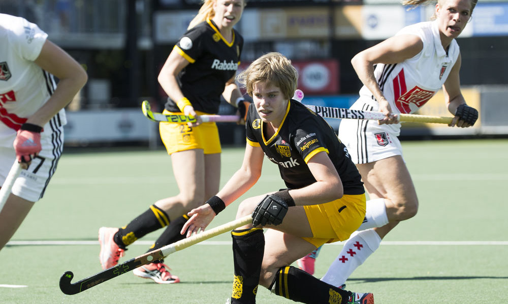 Een echte goaltjesdief is Van der Hoek niet. Ze kwam dit jaar in de Hoofdklasse tot twee treffers. De Jong Oranje-speelster kwam in de zomer over van Wageningen, waarmee ze in het seizoen 2014/2015 al even op het hoogste niveau had gespeeld. Van huis uit middenvelder, startte ze bij de recordkampioen als verdediger, pas later werd ze voorin geposteerd. Een nieuwe plek voor tiener, die groeide in haar rol als spits. ‘Ik kijk veel videobeelden. En ik leer van Lied, Joosje, Marlies en Sian. Die zeggen dat ik niet onnodige meters moet lopen, maar als ik moet lopen dan moet ik ook echt gáán.’