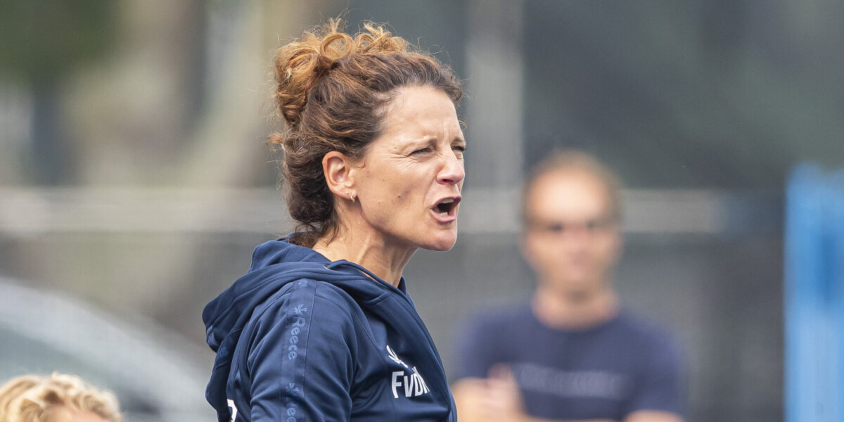 Van de Kieft spreekt haar speelsters toe in het competitieduel met Rotterdam. Foto: Bart Scheulderman