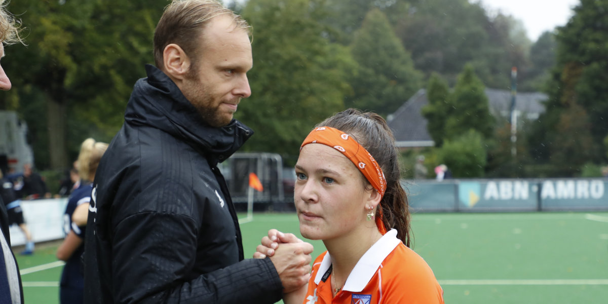 Je ziet het al aan de foto: geliefden Daan Sabel (coach Pinoké) en Sanne Caarls (aanvoerder Bloemendaal) kijken elkaar na de 1-2 overwinning van de Steekneuzen amper aan. Daar is het stel te fanatiek voor. Tegen elkaar spelen vinden ze dan ook vervelend.