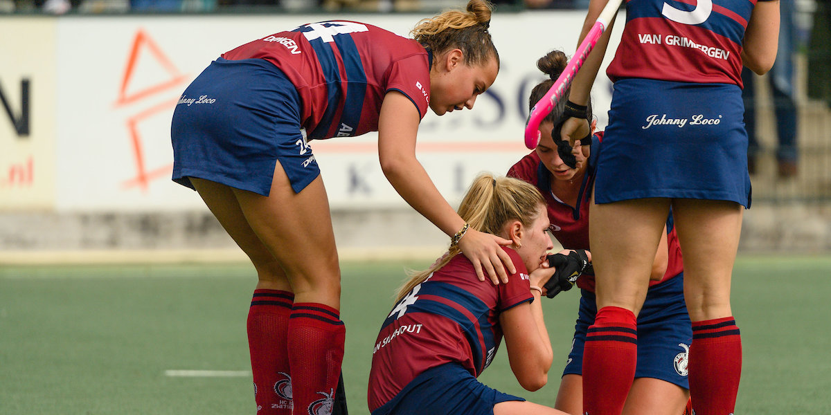 Met nog een paar minuten op de klok tegen HGC deed Klein Zwitserland er alles aan om de 2-0 achterstand recht te trekken. De ploeg zette een extra veldspeelster in voor de keepster. Alles op alles was het motto. Dat dacht aanvoerder Van Silfhout ook toen HGC-spits Dirkie Chamberlain op een leeg doel kon uithalen. ‘Het enige wat ik dacht was: als ze nu schiet, scoort ze’, blikt ze terug. Dus besloot de aanvoerder de bal met haar backhand vol te blokken. Dat lukte, maar de doorzwaai van de Zuid-Afrikaanse belandde per abuis in het gezicht van de captain. De krul van de stick eindigde op het gebit van de speelster van KZ.