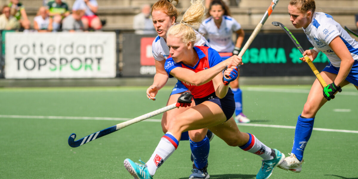 Het complex van Rotterdam is op zondagochtend de plek waar de hele Hoofdklasse Dames samenkomt. Zonder de club uit Eindhoven, maar met een boel bekende gezichten. ‘Ik zag Fiona (Morgenstern, naar Amsterdam) vandaag in het zwart. Daar moest ik even aan wennen. Daphne en Marli (Nikkels en Rybacha, naar Tilburg) in het wit. Dat stond ze goed. Ook aan het groen-geel bij Nora (Bruinsma, naar HDM) kon ik wel wennen. Het is leuk om iedereen weer te zien in nieuwe kleuren, maar ik ben blij met mijn rood-blauw.’