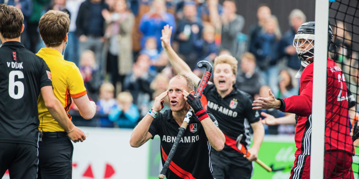 Of dat allemaal nog niet genoeg was, volgden daar twee strafcorners – zwaar bekritiseerd door Amsterdam, de afscheid nemende Klaas Vermeulen zakte theatraal naar de grond, toen de scheidsrechter de beslissing van de derde strafcorner bevestigde – die ook werden gestopt door De Wijkerslooth. En niet zomaar gestopt. Hij gaf bijna geen rebounds weg. Dat was bijzonder knap van de keeper die in de halve finale tegen Bloemendaal ook al een hoofdrol vertolkte in de reguliere speeltijd en pas sinds dit seizoen de vaste eerste keeper is van Amsterdam.