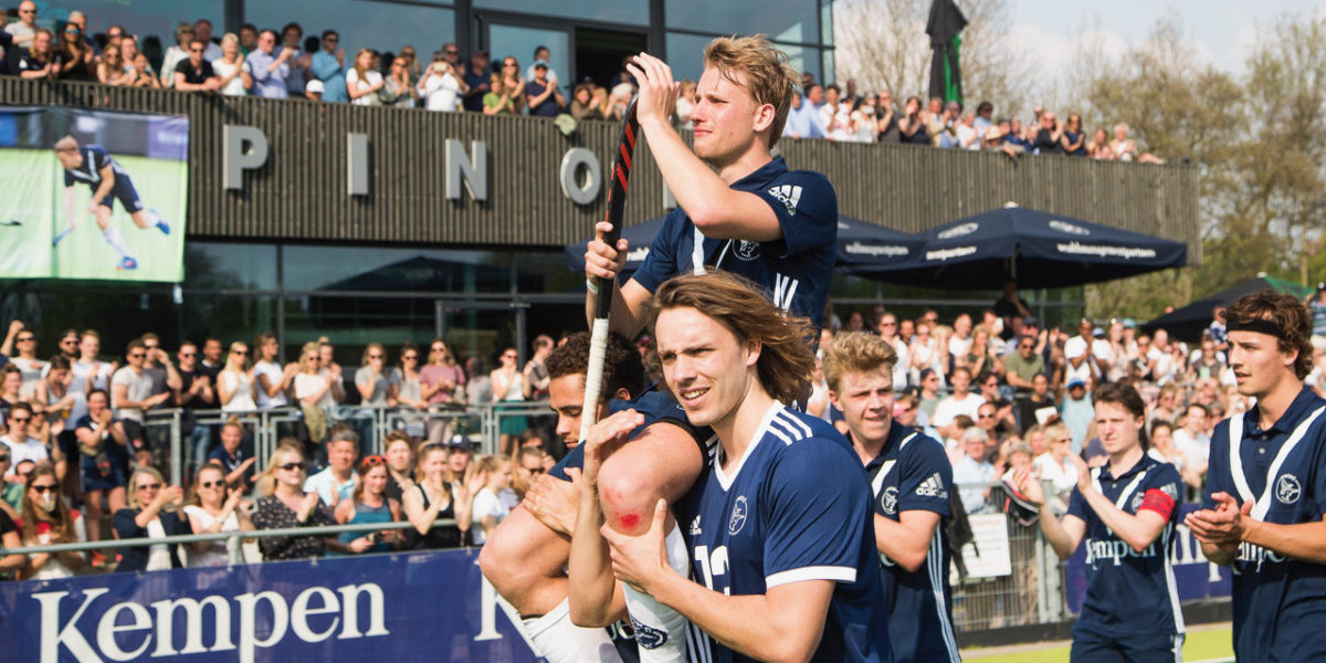 ‘Het besef dat hij hier nooit meer in onze kleedkamer met z’n stick in de hand zal zitten komt heel hard aan. Dat is zó verdrietig. Aan de andere kant is het mooi om het zo met elkaar te kunnen delen. Dit was een waardig afscheid’, vatte Pinoké-coach Jesse Mahieu het emotionele en overweldigende afscheid van de zieke Dennis Warmerdam goed samen. Warmerdam zal door een kwaadaardige tumor in zijn rechterarm nooit meer tophockey spelen. De spits werd zondag letterlijk en figuurlijk gedragen door de club en zijn teamgenoten, waarbij niemand het droog hield.