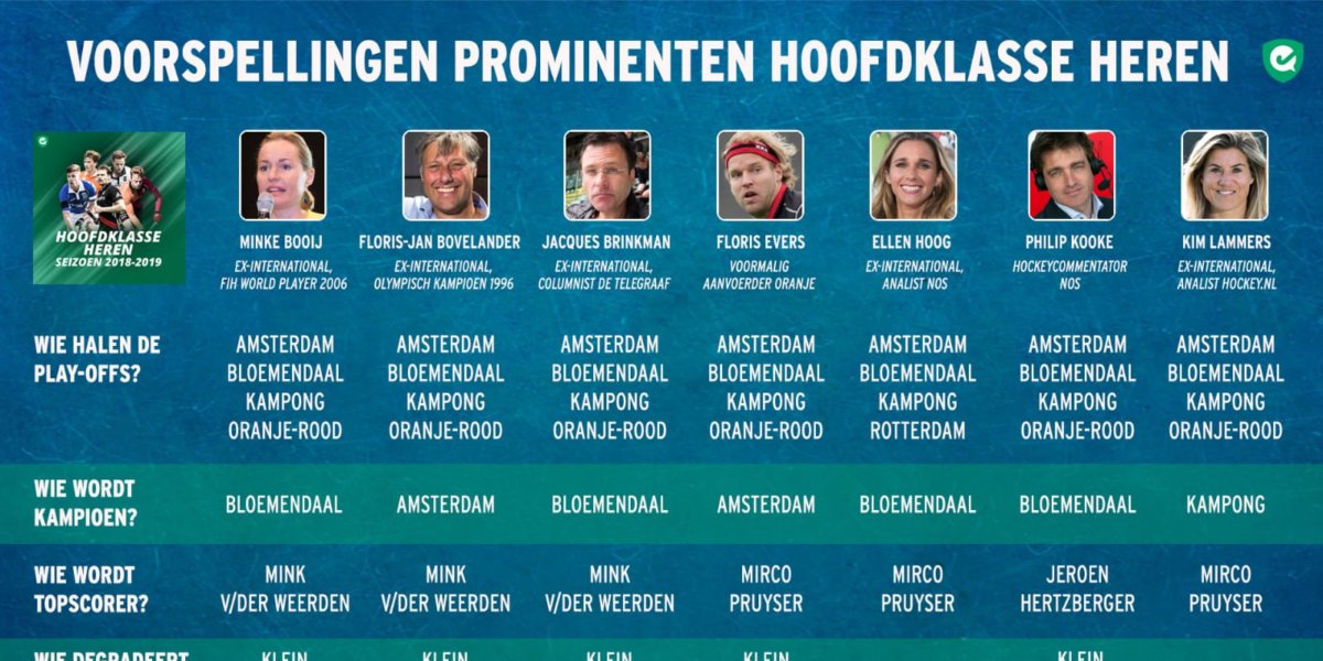 Zowel Kampong, Amsterdam als Bloemendaal worden door hockeyprominenten vier keer genoemd als titelfavoriet, in de voorspelling die ze voor hockey.nl deden. Het belooft dus een spannend seizoen te worden. Over de degradant zijn de prominenten nog meer eensgezind: dat wordt Klein Zwitserland.