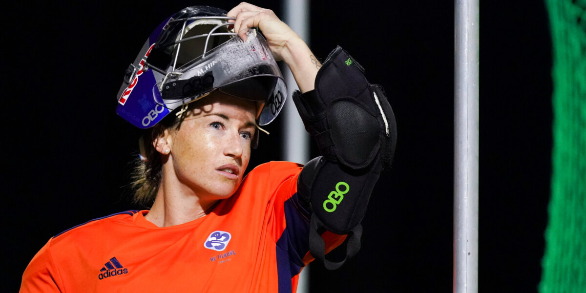 Maddie Hinch droeg op het veld een helm van Red Bull. Foto: Joris Verwijst/Orange Pictures