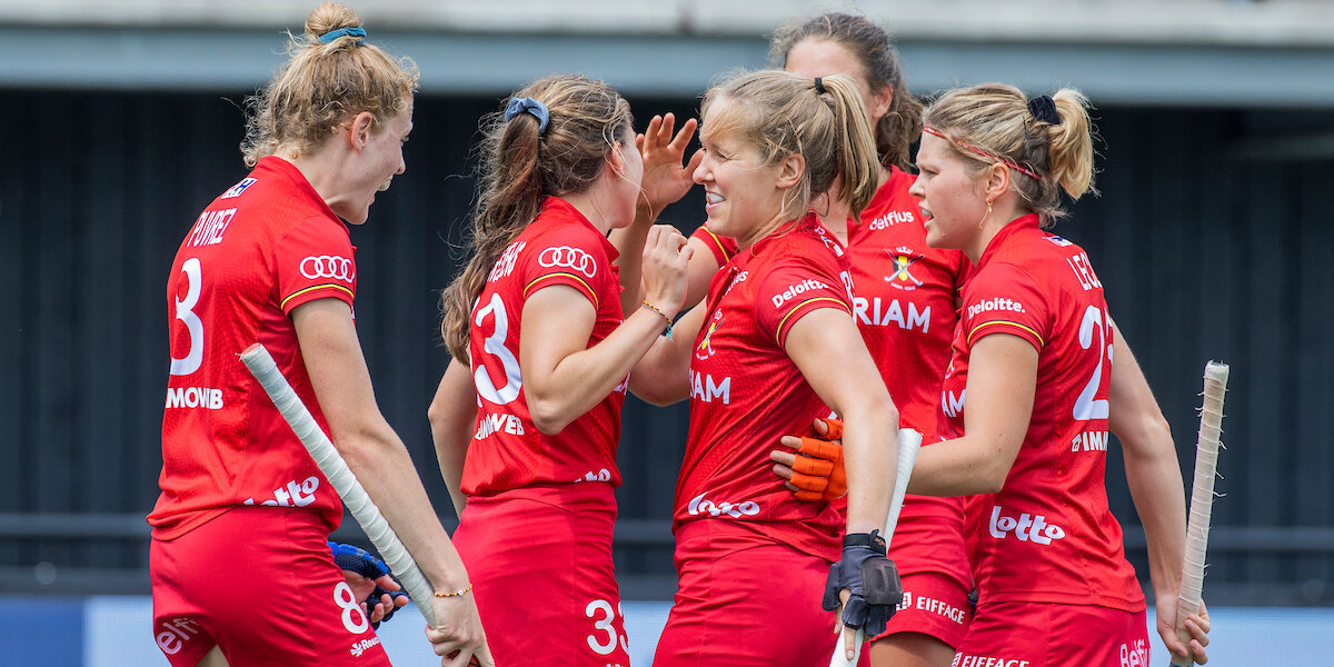 Tot twee keer toe trapt de Belgische aanvalster een stick van een tegenstander weg met haar rechter (scheen)been: afhouden en dus vrije slag voor de verdediging.