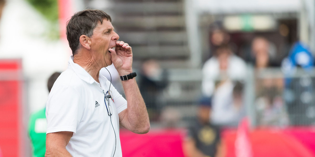 Herman Kruis spreekt zijn speelsters toe. ‘Dat gaat via een tolk. Ze spreken geen Engels. De aanvoerster gaat op Engelse les. Dat vind ik goed.’ Foto: Willem Vernes