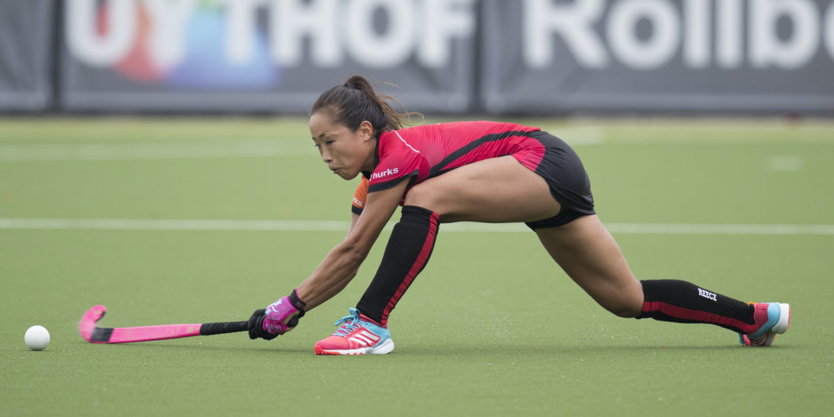 Shihori Oikawa in actie tijdens Kampong-Oranje Rood (0-5) in de Livera Hoofdklasse Dames. Foto: Koen Suyk